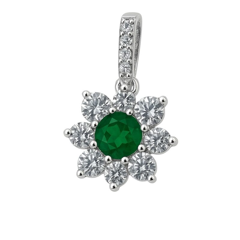 „Emerald Bloom“ ist eine blühende Liebeserklärung an die Kraft der Natur. Der smaragdgrüne Mittelstein erinnert an frisches Blattgrün im Frühling, das neue Lebensfreude bringt. Umrahmt wird er von acht strahlend weißen Zirkonias, die wie zarte Blütenblätter schimmern – harmonisch und kraftvoll zugleich. Die mit drei zusätzlichen Steinen verzierte feste Öse rundet das Design elegant ab.