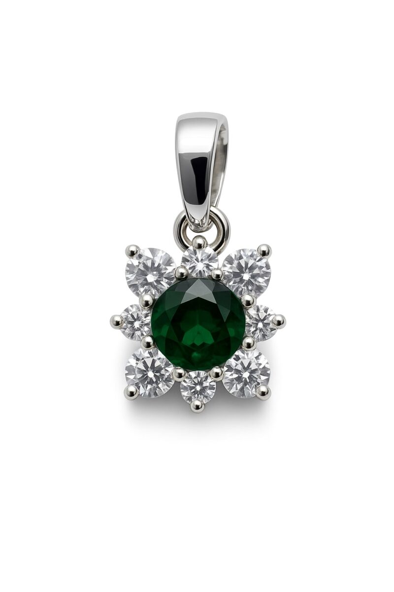 • Besatz: 1 smaragdgrüne Zirkonia in der Mitte, umgeben von 6 weißen Zirkonias; Zieröse mit weißen Steinen