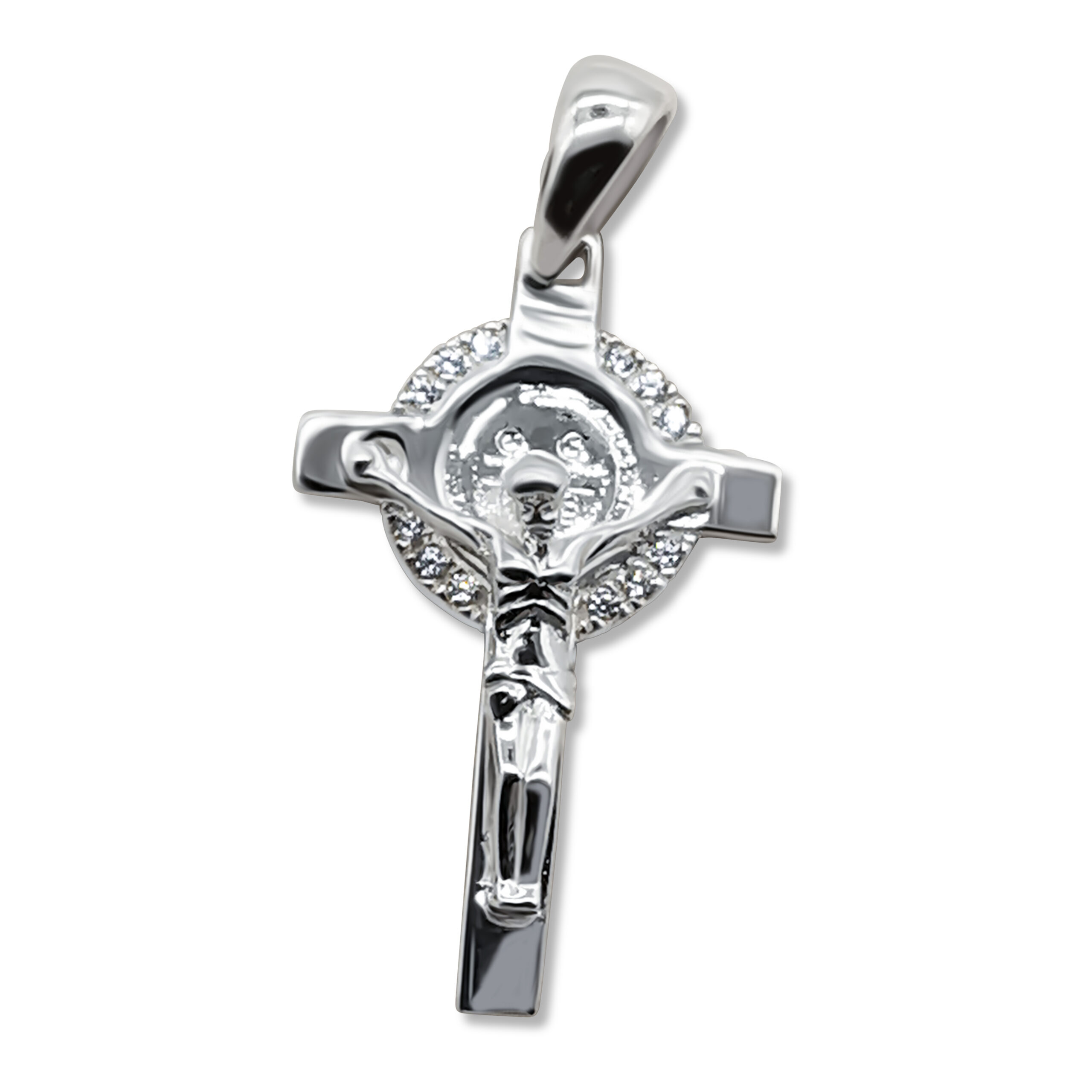 Kreuzanhänger mit Jesus und Zirkonia-Rand – 32 x 16 mm