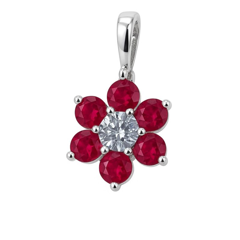 Ein Ausdruck purer Leidenschaft in floralem Design: Sechs rubinrote Zirkonias entfalten sich wie leuchtende Blütenblätter rund um einen weißen Mittelpunktstein, der die Komposition zum Strahlen bringt. Die mit weiteren Zirkonias besetzte Öse verstärkt den luxuriösen Eindruck und schenkt dem Anhänger eine elegante Linienführung. Das Zusammenspiel aus glühendem Rot, funkelndem Weiß und dem kühl-glänzenden Silber verleiht diesem Schmuckstück seine sinnliche, feminine Ausstrahlung.