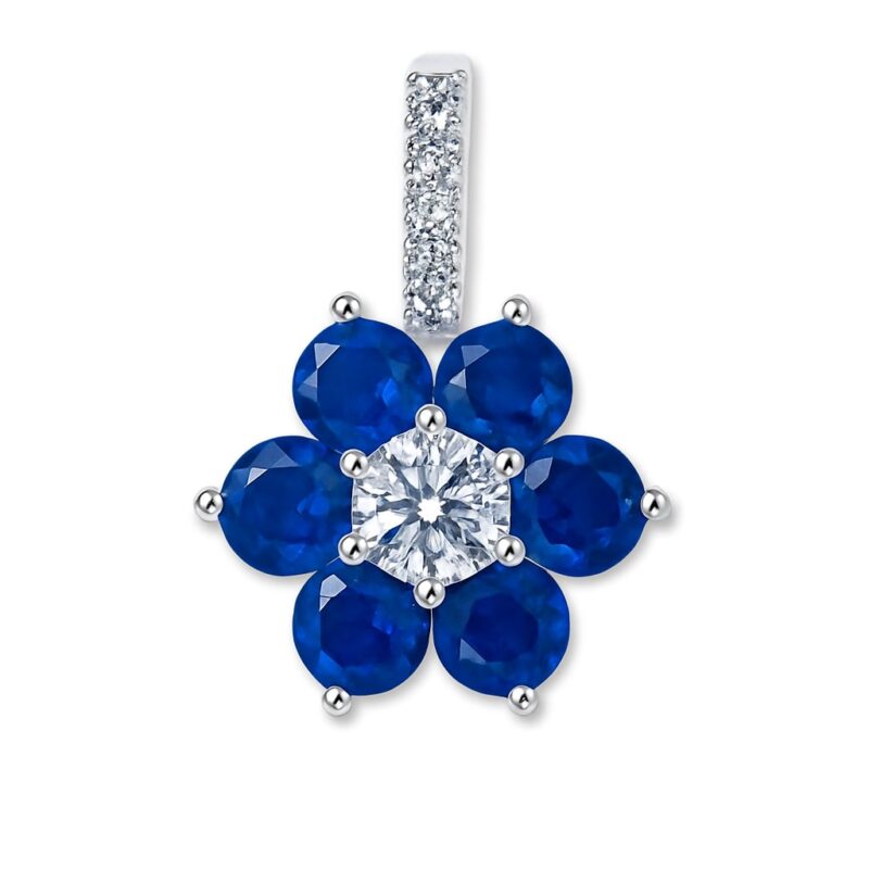 Ein zartes Blütenmotiv mit klarer Präsenz: Die tiefblauen Zirkonias entfalten sich wie samtige Blütenblätter rund um einen strahlend weißen Mittelpunkt. Die elegante, mit weißen Steinen besetzte Öse verleiht dem Anhänger zusätzliche Raffinesse und Glanz. Der Kontrast zwischen dem kühlen Silberglanz und dem intensiven Blau wirkt harmonisch, kraftvoll und edel – eine Hommage an zeitlose Schönheit.