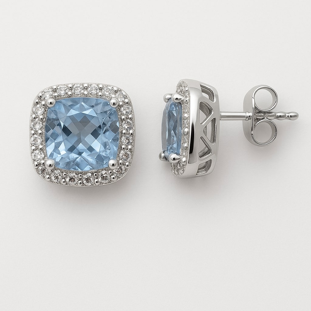 Design: Cushion-Cut Zirkonia in Hellblau, umrahmt von kleinen weißen Zirkonias