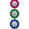 Design: Drei runde Blüten mit farbigem Zentrum – Saphirblau, Rubinrot und Smaragdgrün