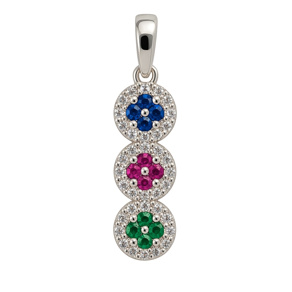 „Tricolore Éclat“ ist ein Symbol für Ausdruck, Vielfalt und Licht. Der Anhänger kombiniert drei runde Blüten in kräftigem Saphirblau, leuchtendem Rubinrot und edlem Smaragdgrün – jede eingebettet in einen funkelnden weißen Zirkoniakreis. Das Design erinnert an eine vertikale Blumenranke – lebendig, verspielt und gleichzeitig stilvoll.