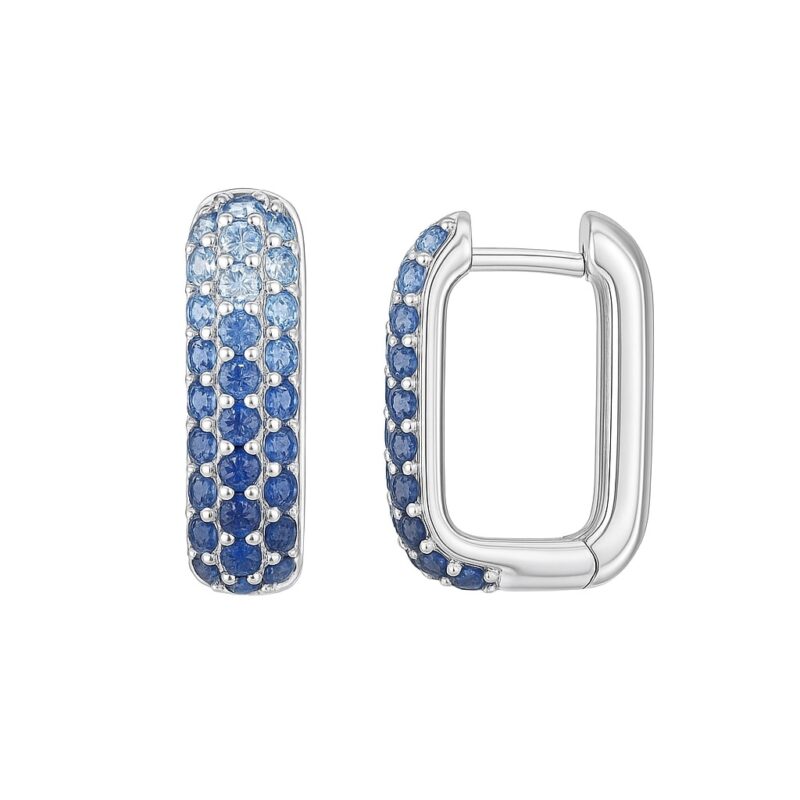 Blue Stripes vereint klassisches Pavé-Handwerk mit moderner Farbgestaltung. Drei Reihen saphirblauer Zirkonia verlaufen von hellem Eisblau bis zu intensivem Nachtblau – ein harmonischer Ombre-Effekt, der Tiefe und Eleganz ausstrahlt. Die rechteckige Form verleiht den Creolen ein urbanes, stilvolles Profil, das sowohl tagsüber als auch abends für bewundernde Blicke sorgt. Ein Design wie ein Farbspiel zwischen Himmel und Meer.