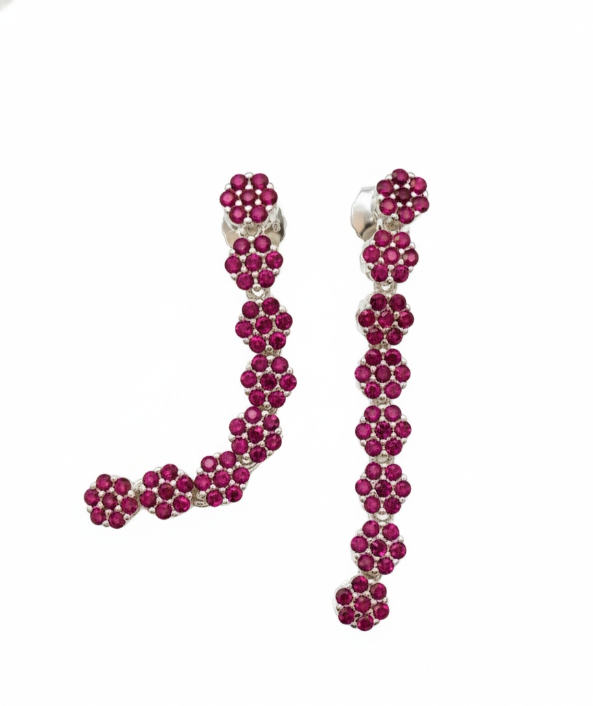Mit ihrer rhythmischen Gliederung aus blütenartigen Zirkonia-Gruppen tanzen die Cherry Motion-Ohrringe bei jeder Bewegung mit. Der intensive Kirschrot-Ton verleiht dem Design eine sinnliche Tiefe – irgendwo zwischen verspielter Eleganz und verführerischer Energie. Eine Hommage an feminine Stärke, lebendige Feste und die stille Magie eines warmen Sommerabends.