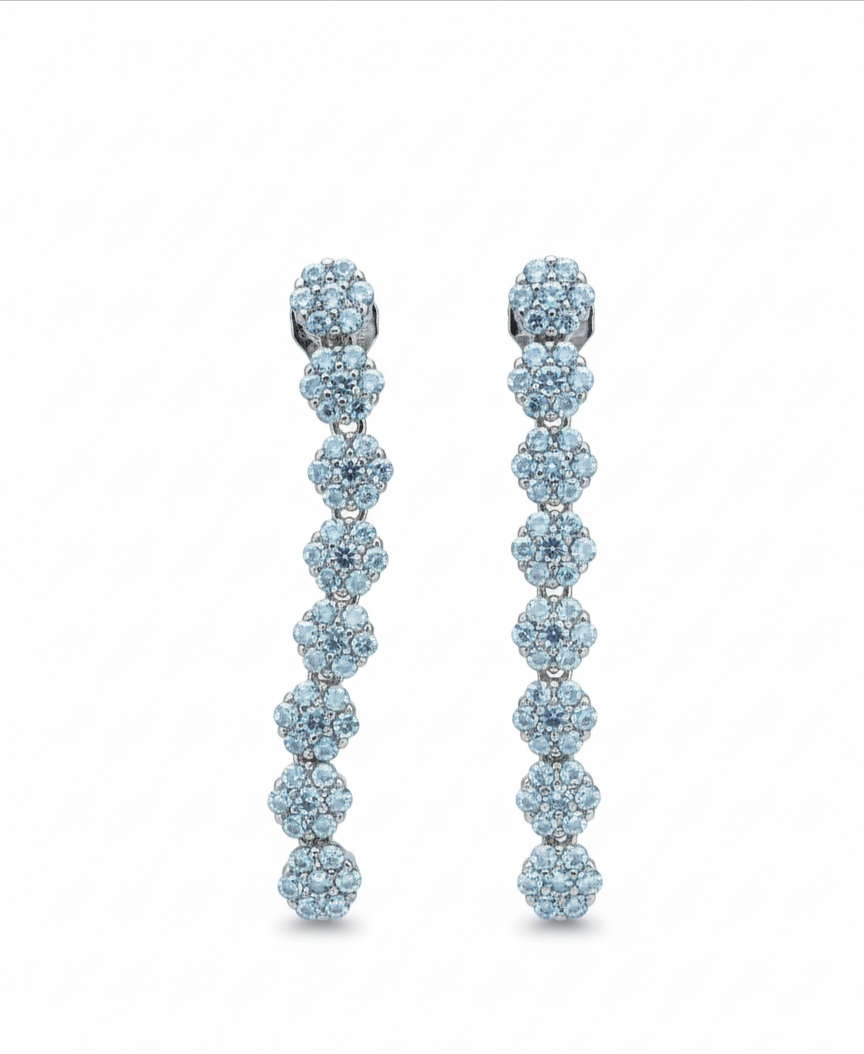 Wie funkelnde Tropfen aus dem Morgenhimmel reihen sich die zart hellblauen Kugelköpfe dieser Ohrringe in rhythmischer Eleganz aneinander.