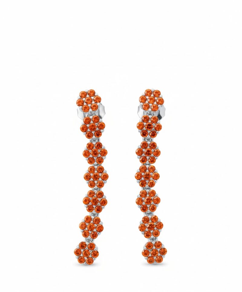 Ein Hauch von Spätsommer auf deiner Haut: Die Sunset Motion Ohrringe vereinen florale Leichtigkeit mit stilvoller Bewegung. Elf zart kugelige Elemente reihen sich elegant aneinander – jeder einzelne besetzt mit feurig-orangenen Zirkonias, die an flirrende Sonnenuntergänge erinnern. Diese Kreation spielt mit Licht, Form und Tiefe – und sorgt für einen schimmernden Auftritt zu jeder Tageszeit.